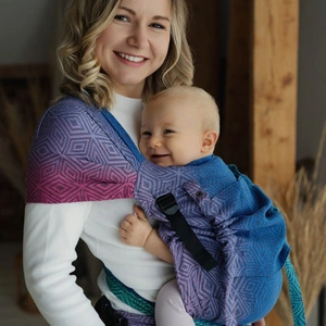Głównym atutem tego nosidła dla noworodka i niemowlaka jest możliwość idealnego dopasowania panelu do wielkości dziecka. Miękkie tkaniny otulają dziecko niczym chusta, a klamra na pasie biodrowym umożliwia łatwe i szybkie zakładanie. Jest to nosidełko wiązane, co pozwala na dodatkowe dopasowanie i stabilizację. Materiał jest przyjemny w dotyku, oddychający, a jednocześnie wytrzymały, dzięki czemu to polskie nosidełko przetrwa długi czas intensywnego użytkowania.