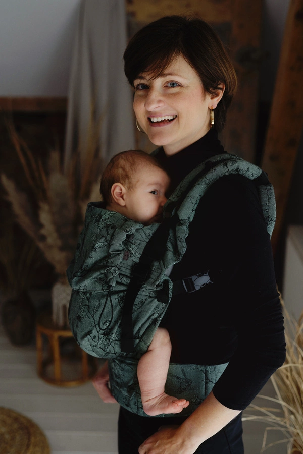 Zakładanie jest szybkie i intuicyjne – wystarczy zapiąć pas biodrowy, ułożyć maluszka, podciągnąć panel, założyć szelki i dociągnąć pasy. W kilka chwil dziecko jest bezpiecznie przytulone, a rodzic zyskuje pełną swobodę ruchów.